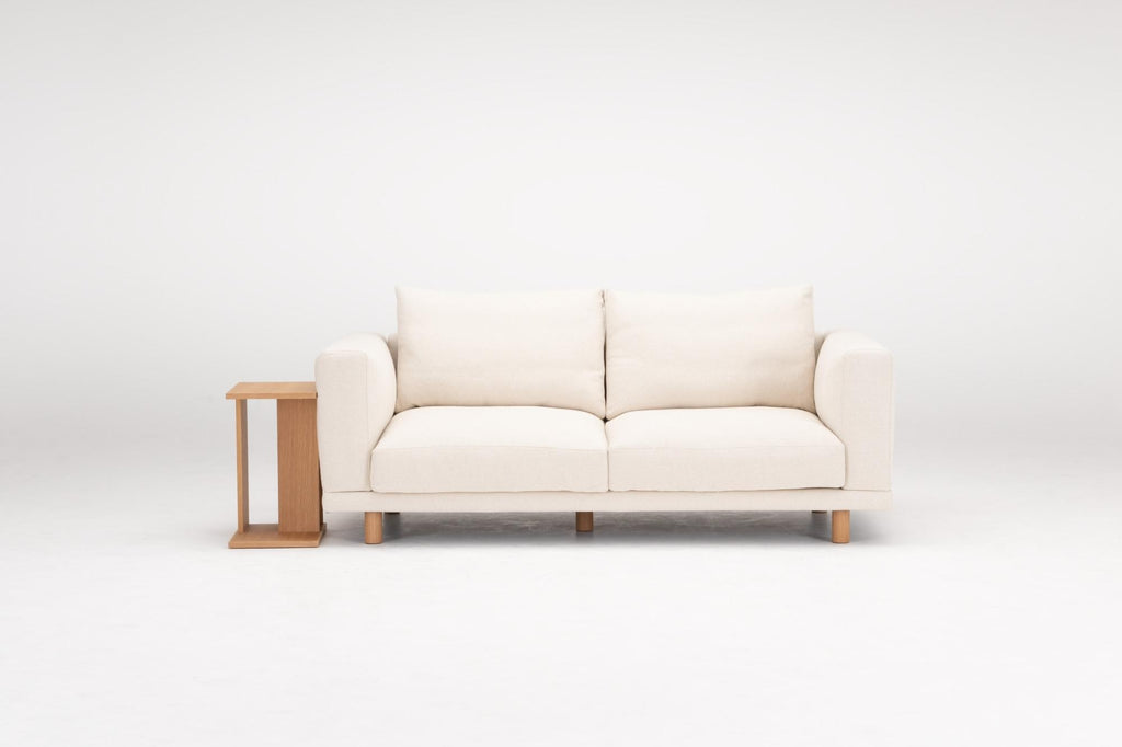 The BUILD Woodarm Sofa is designed with two back cushions made of 100% feathers and a three-layered seat using two types of urethane and feathers with different densities. The wooden arm can be used as a side table for coffee and computers, a shelf for storing books, and a space for decorations.
