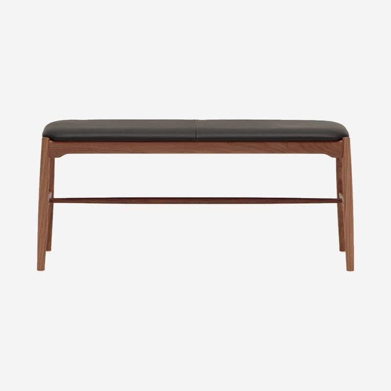 A walnut bench with a smooth black leather seat. With a focus on a smart appearance and comfortable to sit in. Designed by Naoto Fukasawa in collaboration with Actus and made in Japan.