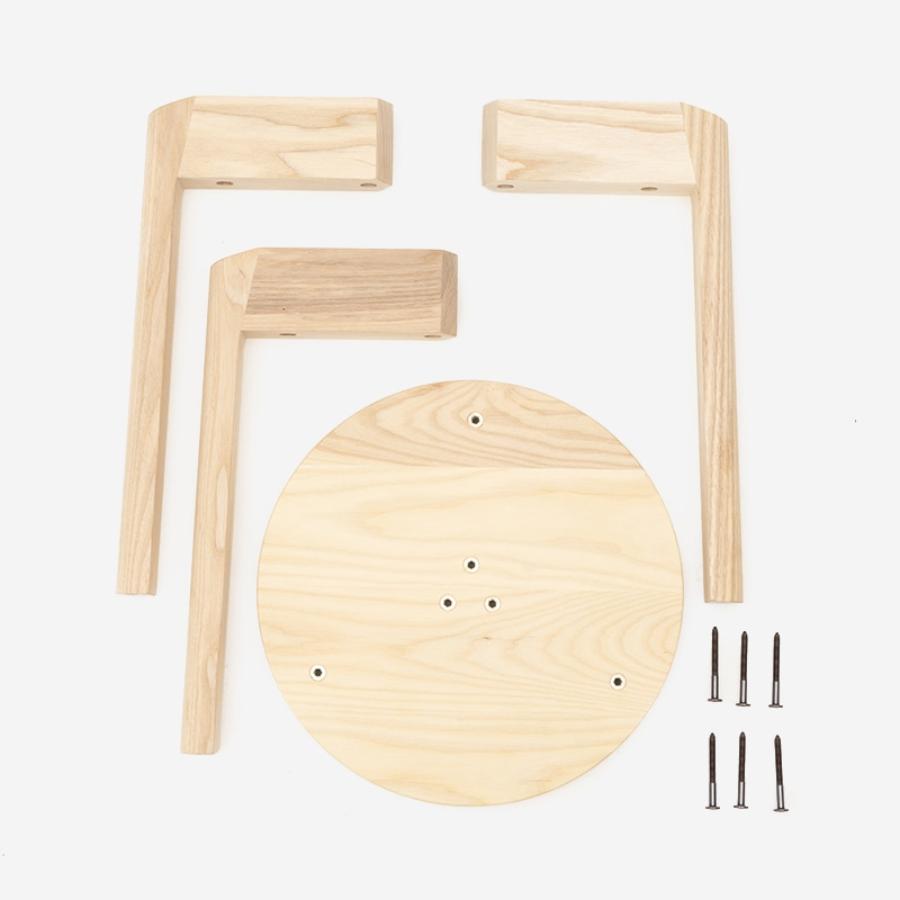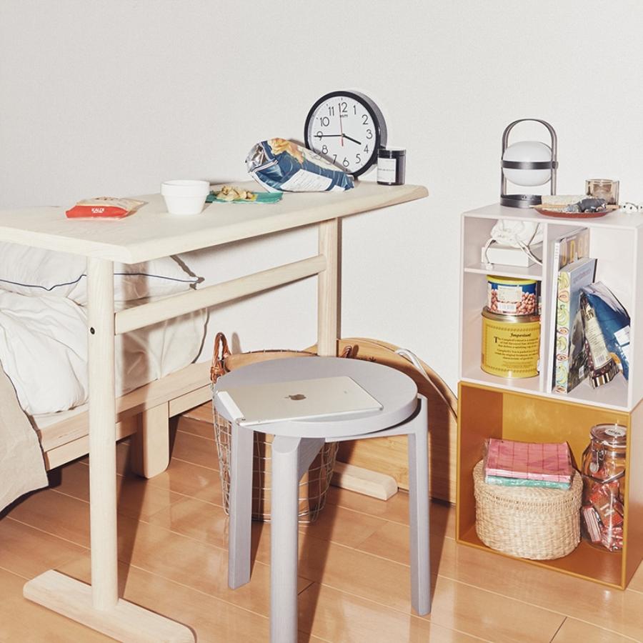 空間の中ですっきり見える3本脚仕様。板座の座面は、生活の中でテーブルに合わせて座るだけではなく、玄関やベッドサイドなどでサイドテーブルや台として使うなど柔軟な使い方ができます。