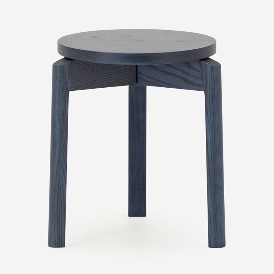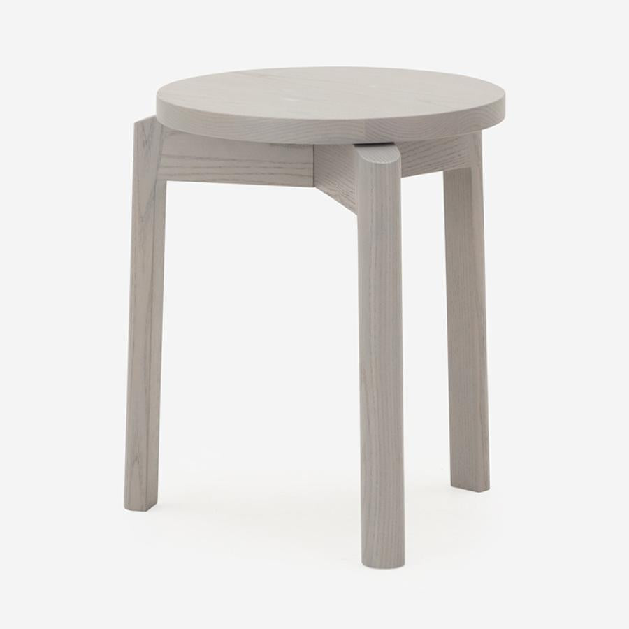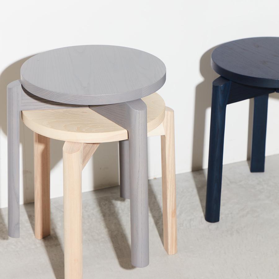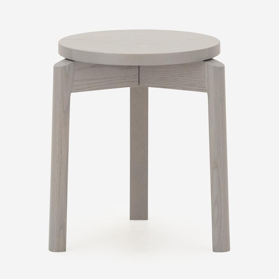 The wooden seat allows for flexible use, such as a side table or pedestal at the entrance or bedside, in addition to sitting at a table. The stools can be stacked not only with each other but also with other chairs in the series to make effective use of space.